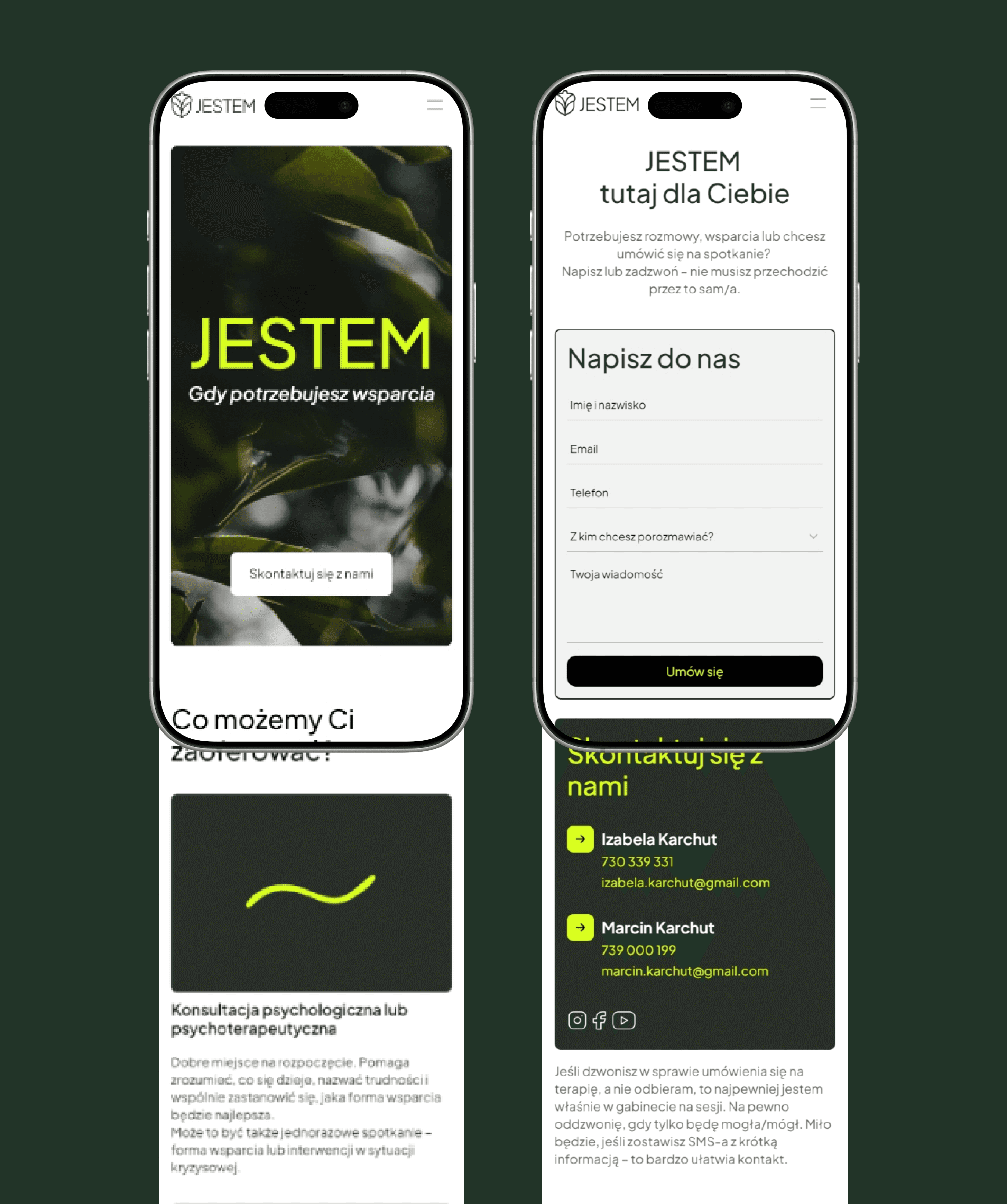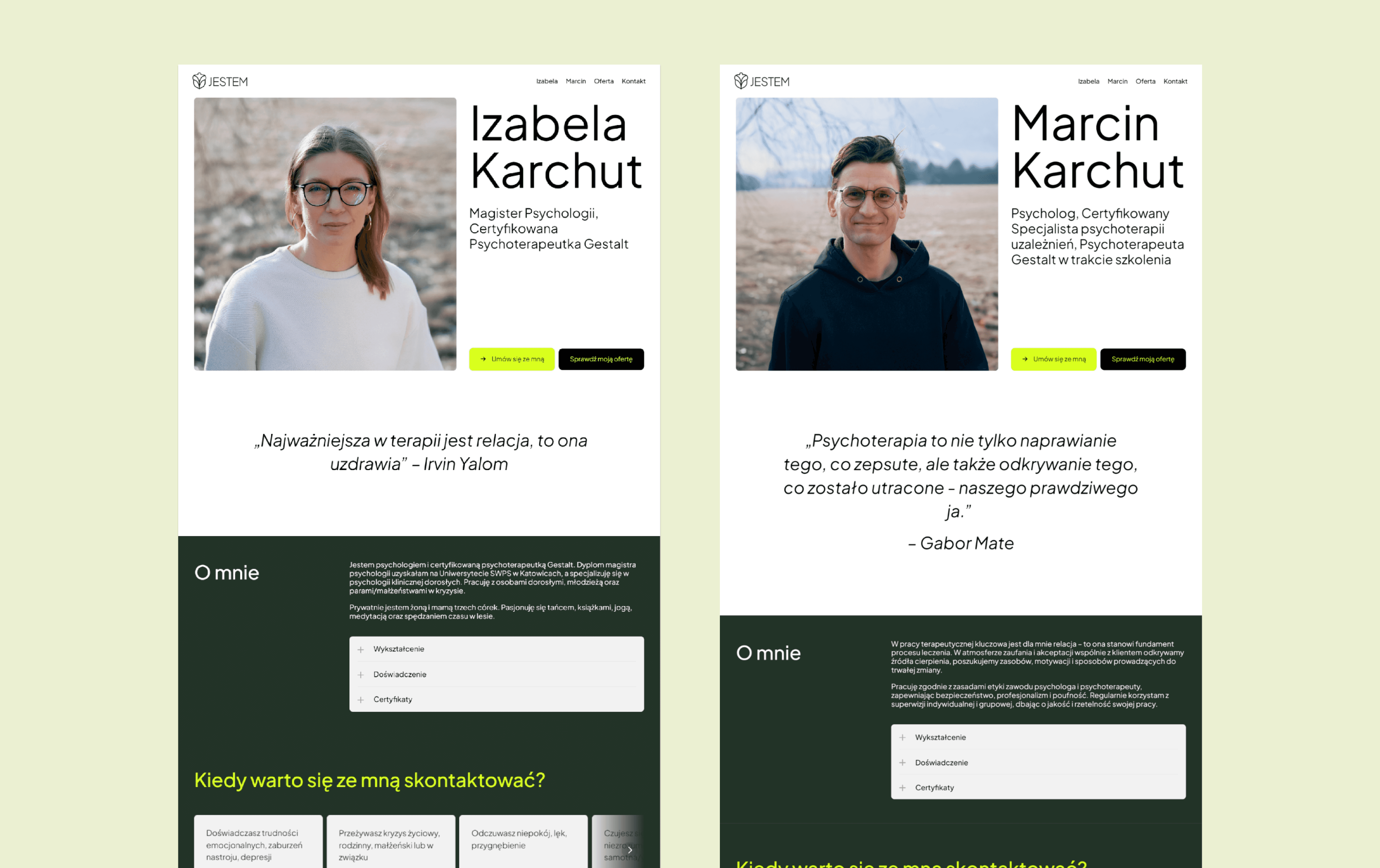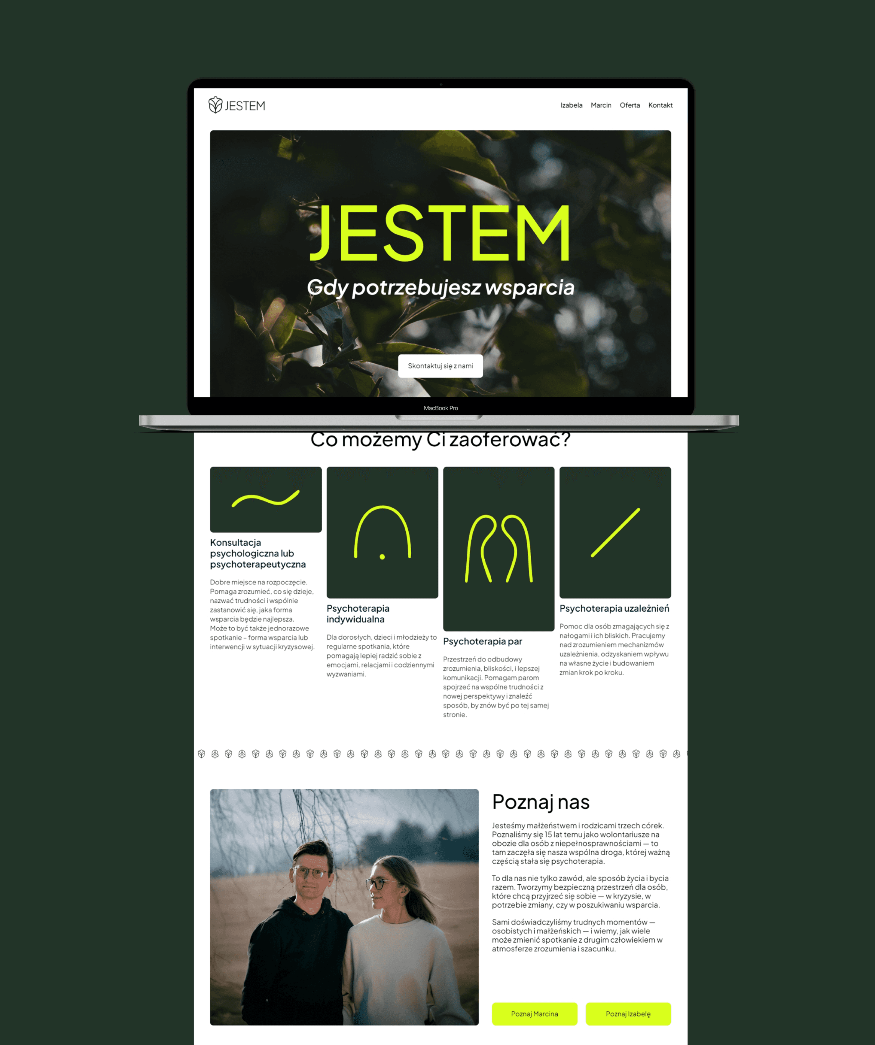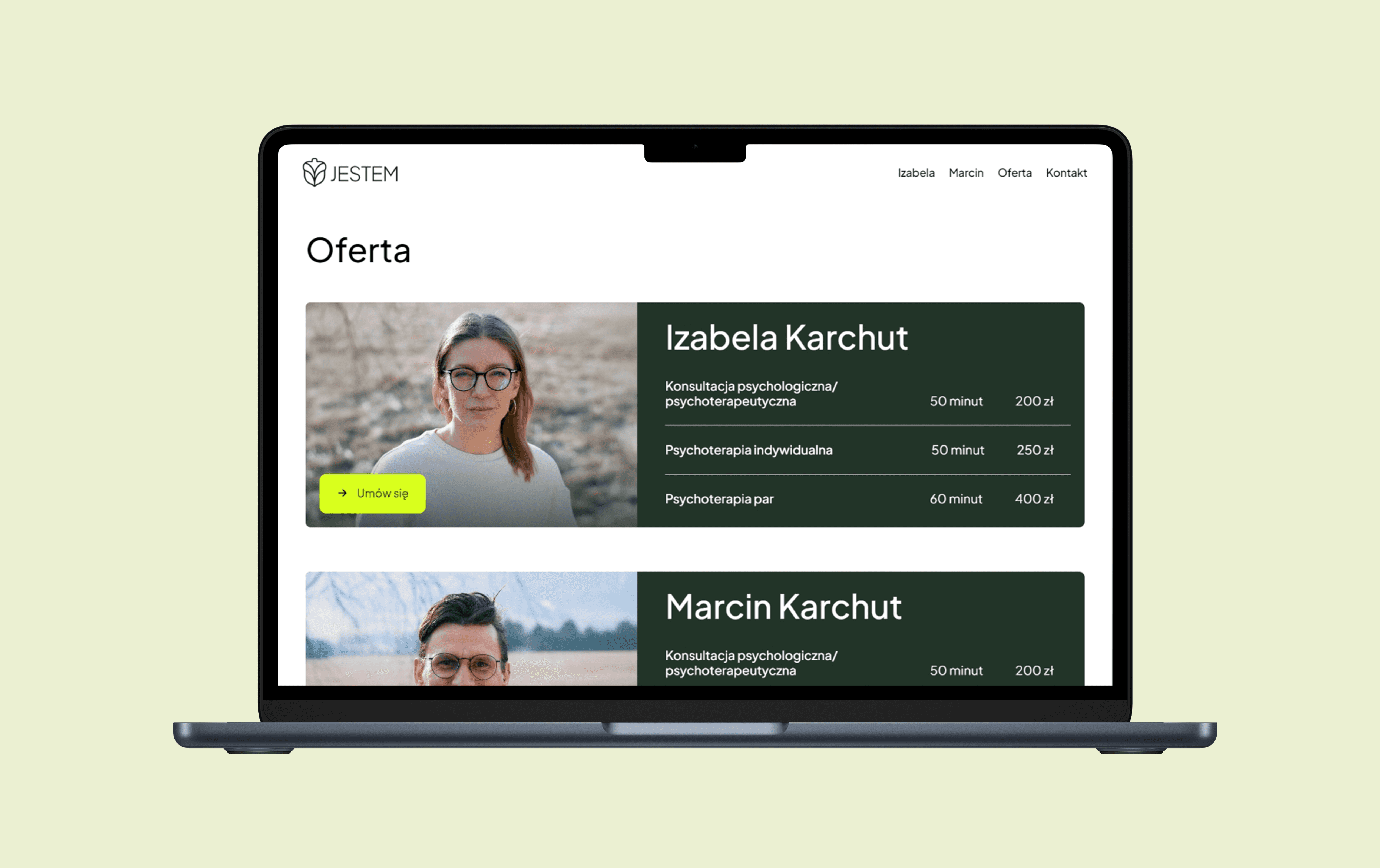 Terapia Jestem to strona internetowa zaprojektowana i wdrożona przeze mnie w Framerze, we współpracy z Jackiem Rysiem. Celem projektu było stworzenie przejrzystej, spokojnej i przyjaznej przestrzeni online, która oddaje atmosferę gabinetu terapeutycznego. Postawiłam na minimalistyczny design, stonowaną kolorystykę i intuicyjną strukturę, aby użytkownik mógł łatwo znaleźć potrzebne informacje i poczuć się komfortowo już od pierwszej wizyty na stronie.